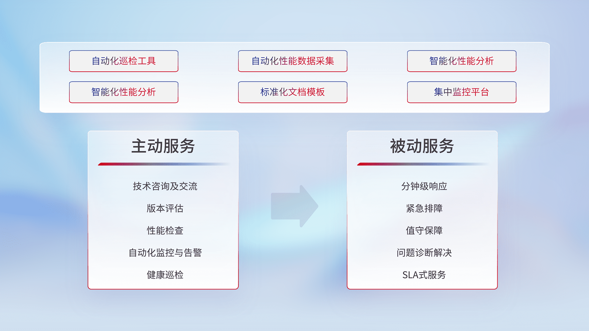 智能化工具和标准化文档,,,保障服务质量,,,,提供主动服务(包含技术咨询、、、、版本评估、、性能检查、、自动化监控与告警、、、健康巡检)和被动服务包含(分钟级响应、、、、紧急排障、、值守保障、、、、问题诊断解决、、SLA服务)。。